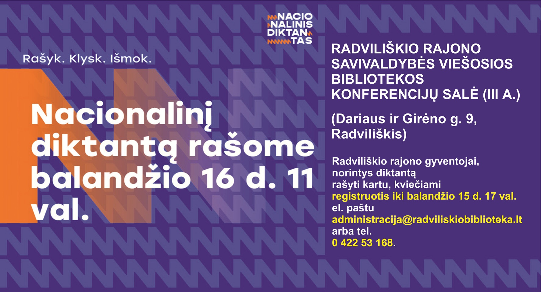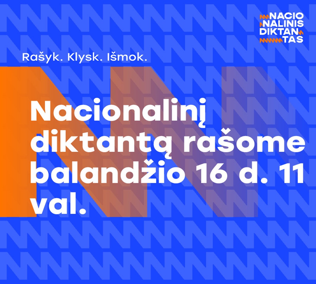 Balandžio 16 d. 11 val. jau 16 kartą Nacionalinis diktantas kvies nebijoti suklysti ir pasitikrinti lietuvių kalbos rašybos įgūdžius. Nacionalinis diktantas – tai tarptautinis suaugusiųjų ir moksleivių raštingumą skatinantis konkursas. Vieniems tai proga pasitikrinti rašybos įgūdžius, kitiems – pasivaržyti, tačiau visiems tai galimybė didžiuotis unikalia lietuvių kalba, o ir padarius klaidų – išmokti ko nors naujo. Nacionalinis diktantas bus transliuojamas per LRT Radiją.