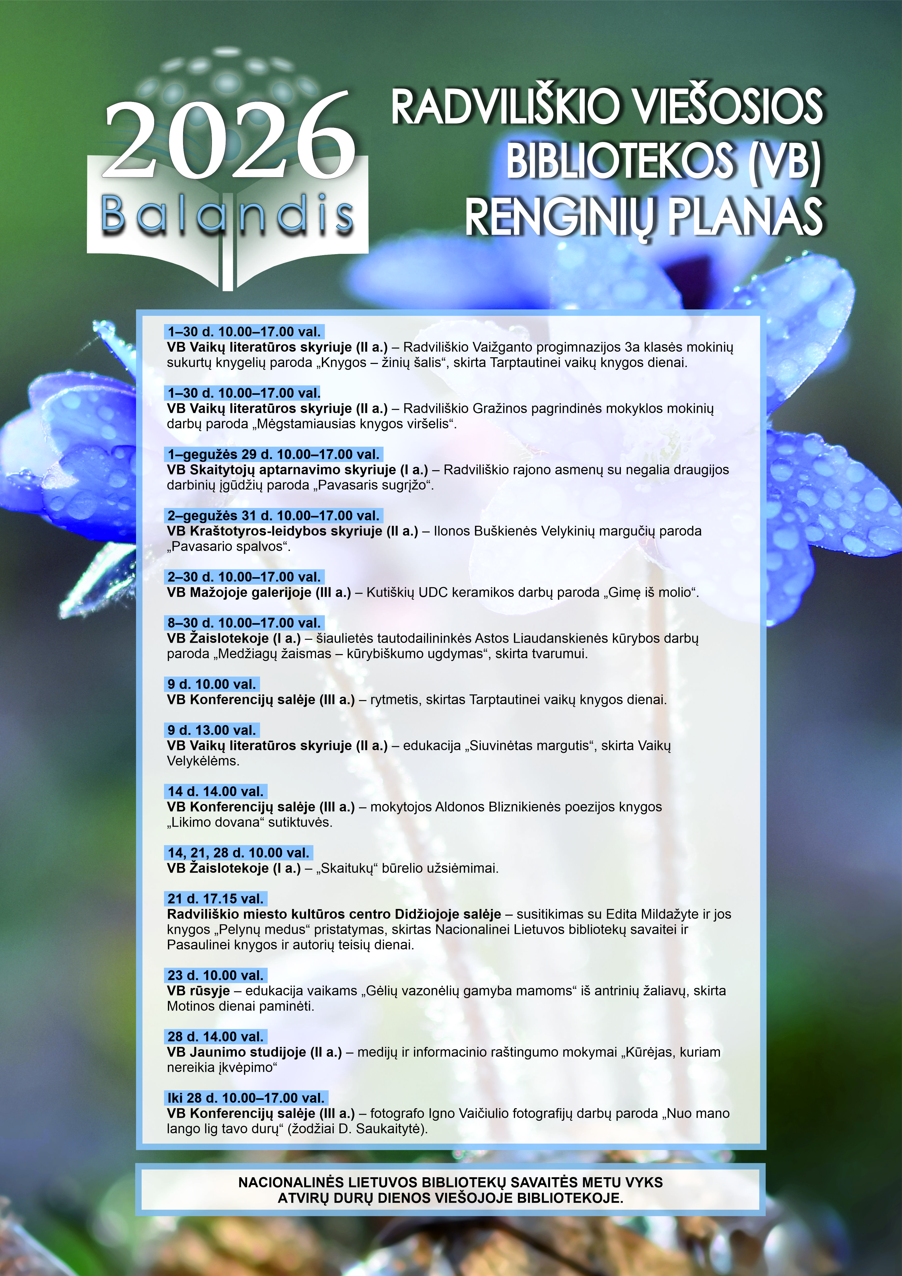 2026 m. balandžio 23–29 d. vyks Nacionalinė Lietuvos bibliotekų savaitė. Šia Lietuvos bibliotekininkų draugijos (LBD) organizuojama ir visas šalies bibliotekas vienijančia iniciatyva siekiama skatinti skaitymą, kviesti bendruomenes lankytis renginiuose ir prisijungti prie įvairių iniciatyvų, pristatyti visuomenei Lietuvos bibliotekininkų profesiją, o taip pat – paskatinti pačius bibliotekininkus švęsti savo profesiją. Nuo 2001 m. minimos jau 26-osios Nacionalinės Lietuvos bibliotekų savaitės tema šiais metais – „Skaityk tarp eilučių“, kviečianti sužinoti daugiau apie bibliotekininkų profesinį įsipareigojimą priešintis visų formų cenzūrai, remti visuomenės skaitymo laivę bei teisę į kokybišką ir patikimą informaciją.