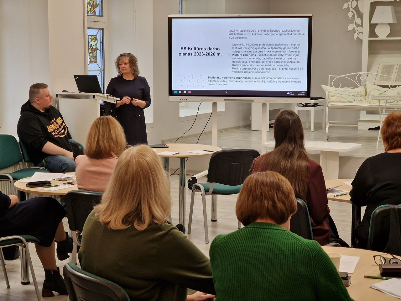 Pirmąjį pranešimą „Viešųjų bibliotekų daugiafunkciškumo plėtra Europos Komisijos ataskaitos kontekste: rekomendacijos bibliotekų stiprinimui ir bendruomenių įtraukimo perspektyvos“ skaitė Lietuvos Respublikos kultūros ministerijos Atminties institucijų politikos grupės patarėja Gražina Lamanauskienė. Ji pristatė ES Kultūros 2023–2026 m. darbo planą, kuriame buvo numatytas bibliotekų vaidmens stiprinimas. Juo siekiama pripažinti ir sustiprinti bibliotekų indėlį į demokratiją, socialinę įtrauktį, kultūrinę įvairovę ir švietimą visoje Europoje. Pasak G. Lamanauskienės, bibliotekos yra visiems prieinamos ir geografiškai plačiai paplitusios institucijos, kurios užtikrina lygias prieigos sąlygas kiekvienam, nepriklausomai nuo amžiaus, socialinės padėties, išsilavinimo ar ekonominių galimybių. Todėl bibliotekose vykdomos veiklos yra arčiausiai gyventojų.