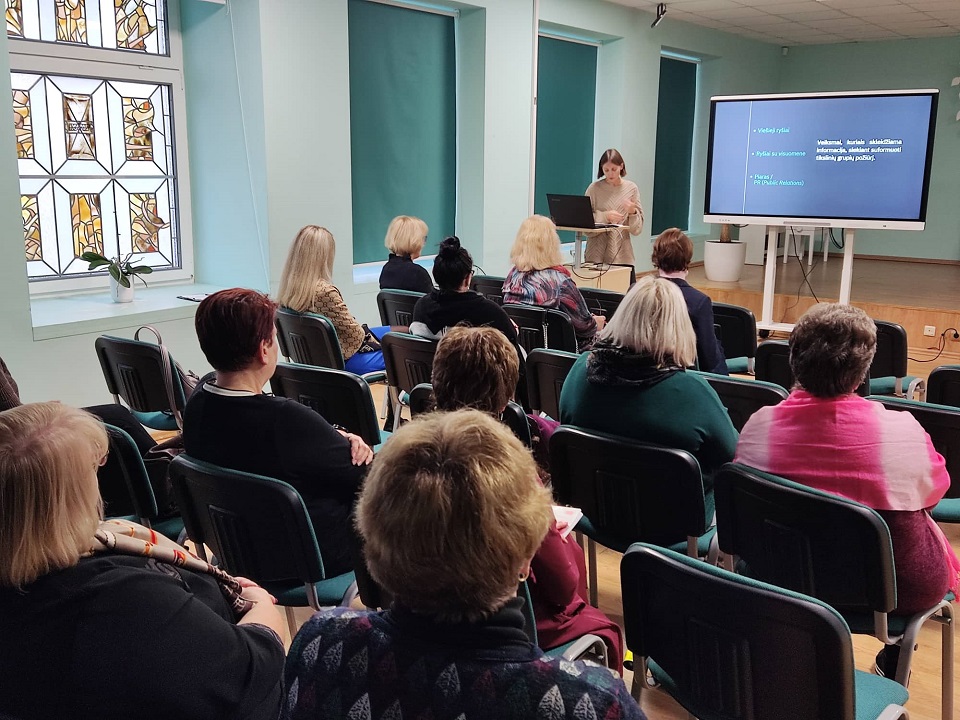 Lektorė, komunikacijos specialistė, kultūros žurnalistė rašytoja Dovilė Raustytė-Mateikienė bibliotekų darbuotojus supažindino su viešaisiais ryšiais, jų svarba, pasakojo apie socialinių tinklų naudą kasdieniniame mūsų gyvenime, pristatė populiariausius socialinius tinklus Lietuvoje ir pasaulyje. Daugiausia dėmesio pranešėja skyrė socialinio tinklo „Facebook“ ir „Instagram“ apžvalgoms. Komunikacijos specialistė D. Raustytė-Mateikienė pristatė neigiamus ir įkvepiančius reklamos pavyzdžius, aiškino, kaip teisingai reikia kurti reklamą socialiniuose tinkluose: viešinant savo veiklas pritraukti daugiau skaitytojų bei lankytojų, sudominti juos renginiais, skatinti knygų skaitymą.