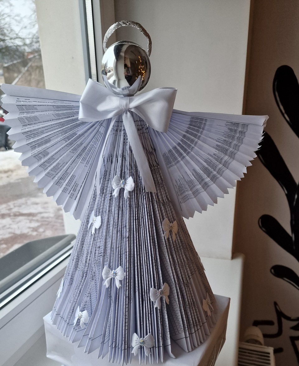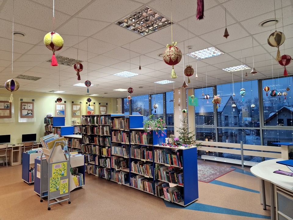 Bibliotekos lankytojai, tikriausiai, jau pastebėjote mūsų šventiniais vainikais papuoštą bibliotekos įėjimą. Už šias padovanotas dekoracijas dėkojame mūsų partnerei – gėlių parduotuvei „Monikos gėlės“. Užėjus į biblioteką, pirmajame aukšte, kviečiame pasigrožėti papuoštomis eglutėmis, Skaitytojų aptarnavimo skyriuje – menininkės Ilonos Buškienės kalėdinių žaisliukų paroda „Kalėdoms artėjant“, Žaislotekoje – kraštietės Angelės Jovaišaitės paroda „Angelo pėdos“, languose – bibliotekos darbuotojų kurtais angelais. Pakilus į antrąjį aukštą, Vaikų literatūros skyriuje, galėsite pasigrožėti mokytojos Onos Gabenienės kūrybiniais darbais „Burbulų magija“, Vaikų skyriaus darbuotojų papuošta žaliaskare. Kraštotyros-leidybos skyriuje ir Informacijos leidinių ir interneto skaitykloje išsibarstė šventiniai žaisliukai, stalą puošia darbuotojų kurta kalėdinė kompozicija. Trečiajame aukšte visų laukiame prie šventinės knygos-sienos. Čia galėsite tapti knygos herojais – nusifotografuoti ir atsiųsti mums savo nuotrauką, kurią vėliau publikuosime naujametiniame nuotraukų koliaže. Viešosios bibliotekos trečiajame aukšte yra įsikūręs Komplektavimo skyrius. Jame pažiro darbuotojų iškarpytos snaigės. Konferencijų salėje – lempučių „dangus“, puošia šventinės girliandos ir angelai.