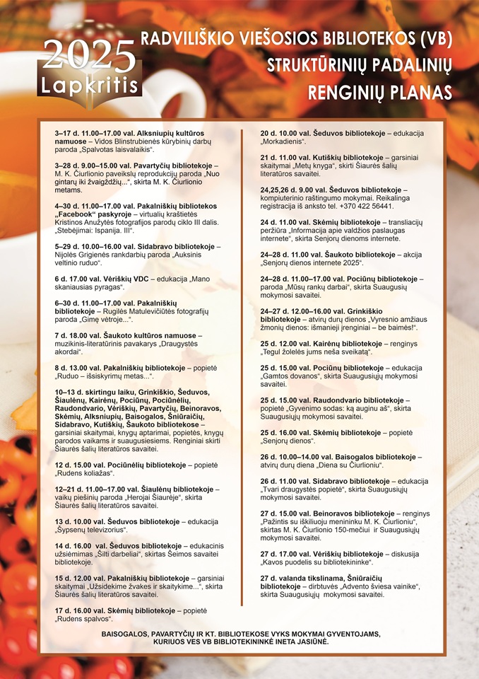 Radviliškio viešosios bibliotekos struktūrinių padalinių 2025 m. LAPKRIČIO MĖN. renginių planas