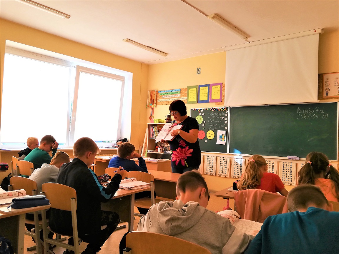 - Mokytoja R. Žalienė skiria užduotis mokiniams.