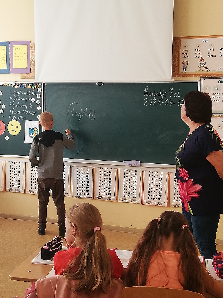 Mokytoja Regina Žalienė kvietė prie lentos mokinius ir liepė rašyti žodžius bei nagrinėti juos žodžių dalimis. Rankų miškas parodė, kad vaikai gerai įsisavinę šią temą. Bibliotekininkė ant lentos užrašė žodžius ne iš vadovėlio, vaikai lengvai susitvarkė ir su šia užduotimi.